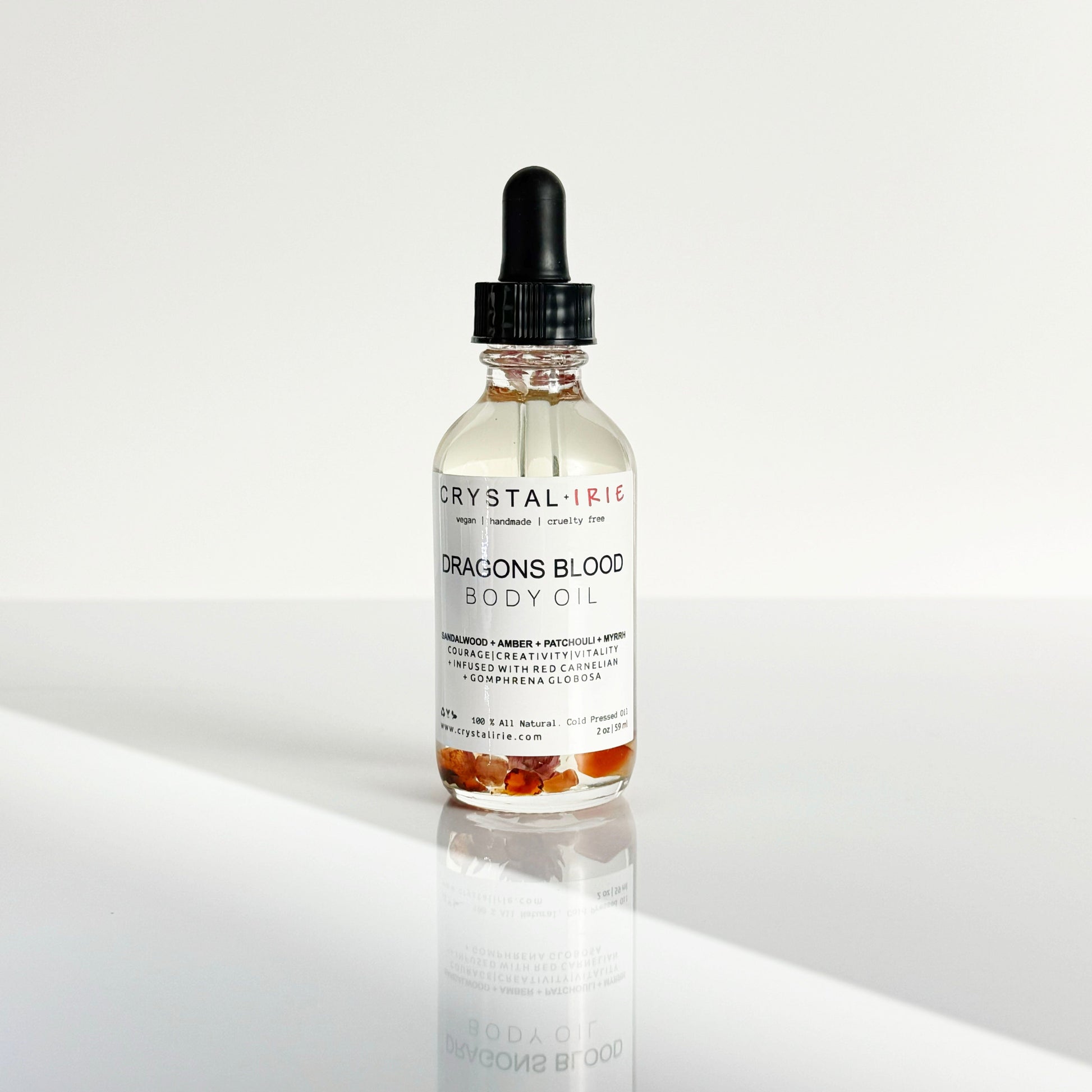 This oil is infused with Dragon’s Blood–inspired aroma, traditionally used for grounding, focus, and energetic protection, along with Gomphrena Globosa (Immortal Flower)—a botanical known for its antioxidant, antibacterial, and detoxifying properties that help protect skin from environmental stressors. Red Carnelian crystals are traditionally associated with vitality, confidence, creativity, and motivation, believed to support physical energy, courage, and self-esteem.