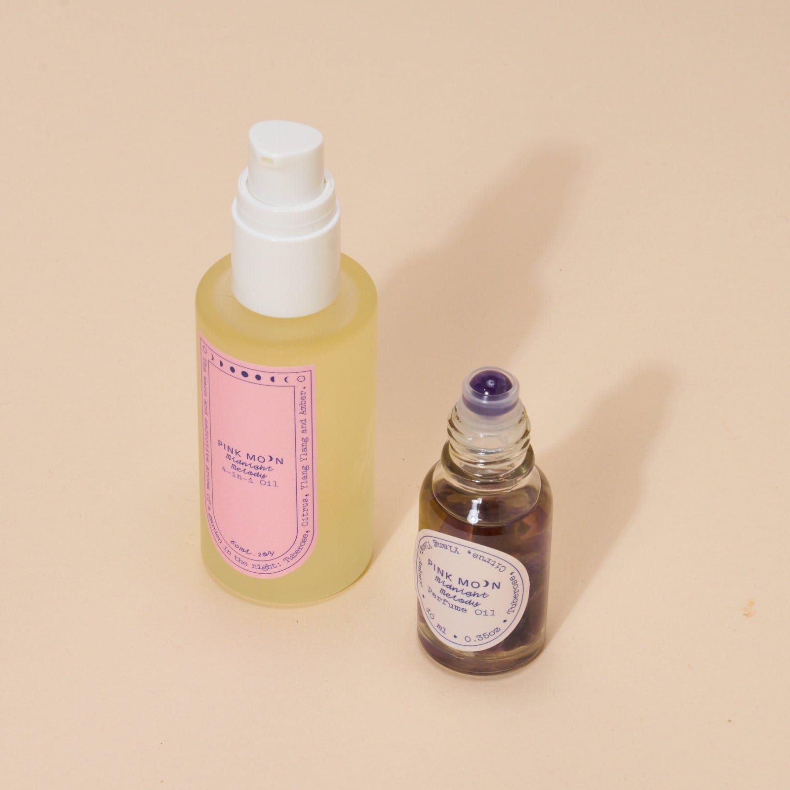 Massage 1–2 pumps of the 4-in-1 Oil onto damp skin after bathing or showering. Apply to hair ends or scalp as needed. Finish by rolling the Perfume Oil onto pulse points — wrists, neck, and heart space.